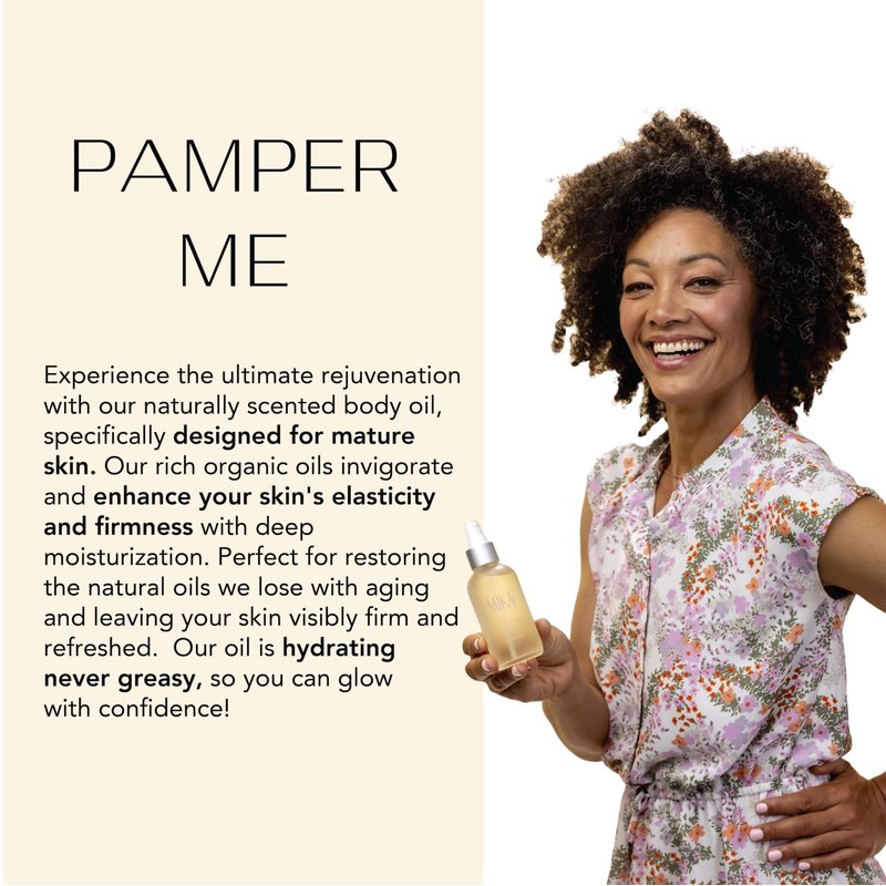 Specialized Care for Women! Mika Vie Pamper Me Body Oil is specifically formulated for women over 40, providing the nourishment your skin needs to stay soft, hydrated, and glowing. As women transition into perimenopause and menopause, a natural drop in estrogen levels causes a decrease in body oils, leaving skin feeling dry and less radiant. Our organic blend helps to rejuvenate your skin, reducing the appearance of fine lines and promoting a youthful glow. Organic and Safe Ingredients Enjoy the pure benefits of 100% plant-derived, certified organic ingredients in our shower oil for women. Free from harmful chemicals like phthalates and parabens, and free from synthetic fragrances, it offers a safe skincare solution. Infused with natural Bergamot and Ginger oils, it provides a soothing aromatherapy experience, enhancing your skincare routine with gentle, uplifting fragrances. Easy Application and Ethical Production Our body oil is formulated for easy daily use. Apply it generously to wet or damp skin after a shower to lock in moisture, or use it on dry skin for a quick hydration boost. The non-greasy formula absorbs quickly, leaving your skin smooth and soft. Proudly made in the USA, this vegan and cruelty-free body oil promotes ethical beauty practices. By choosing our product, you support sustainable skincare solutions that are better for the environment.