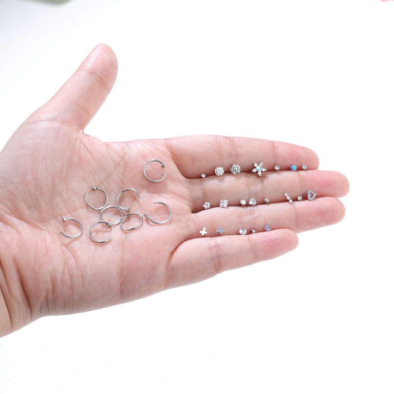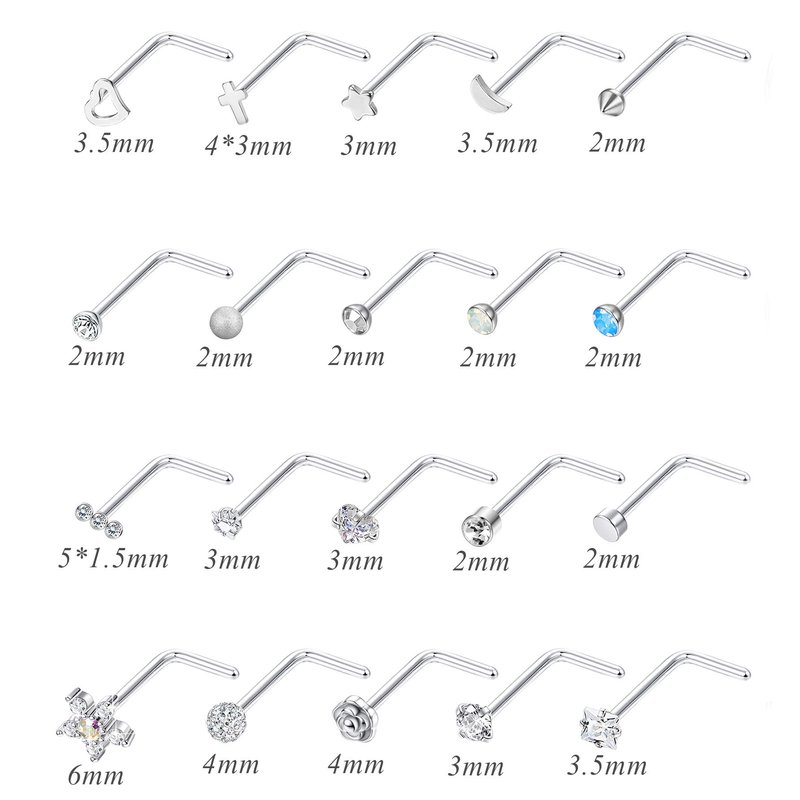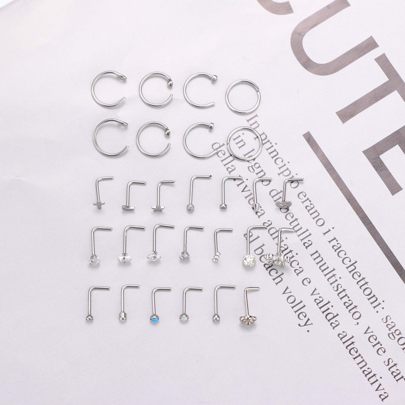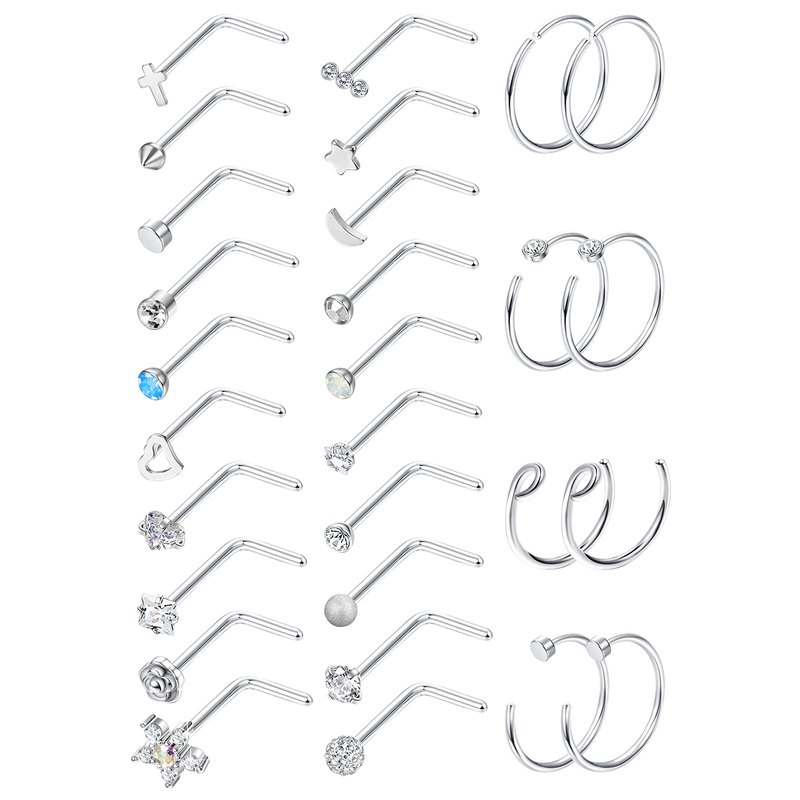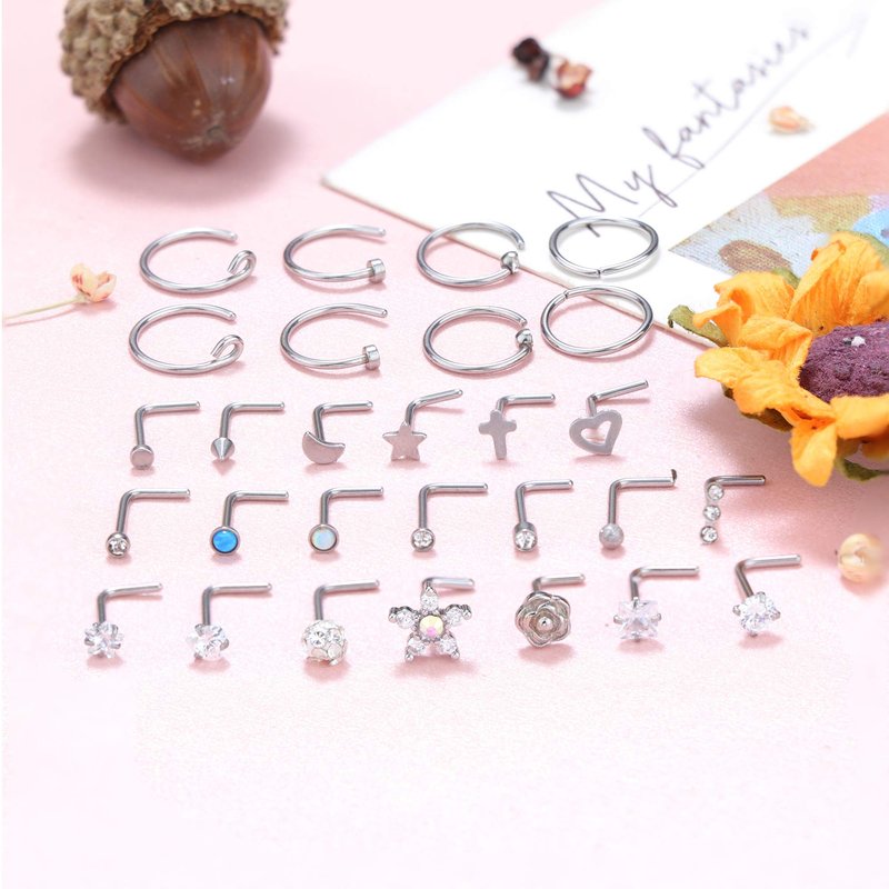 - [NOSE PIERCING SET]: One order you will get 28pcs nose studs & nose rings. They are simple and elegant for daily jewelry. NOSE RINGS - 4 different styles, each style one pair; NOSE STUDS - 20 different styles, round cz, square cz, star, heart, ball, opal, arrow and flat disc etc. 3 types of pin - Classic L, Screw, Bone Shaped. Best piercing set choices for you