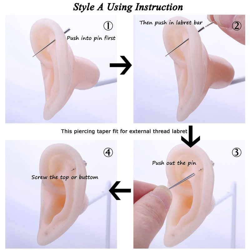 - ✨【Using Instructions】: 1.Put a half part of piercing taper into the ear hole. 2.Push piercing bar into the thread/hole/pin of the taper, then push through totally your ear hole slowly and softly. 3.After through your ear hole, take the taper out of the hole and let the piercing bar stay. 4.Screw the piercing top or bottom. Thread/hole/pin at the end helps prevent slipped and cover internal thread to avoid injury while piercing