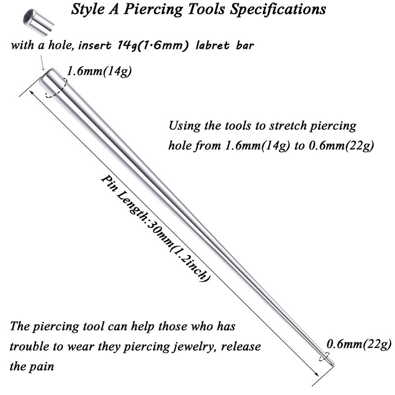 - ✨【Size of Piercing Kit】: Sold as 3pcs, all pierce end is 22g(0.6mm), taper gauge size is 18g(1.0mm), total length is 30mm (approx 1.2 inch), with a thread/pin/hole at the end which insert into the shaft of the piercing jewlery, fit for 18g(1.0mm) internal/external thread labret piercing jewelry