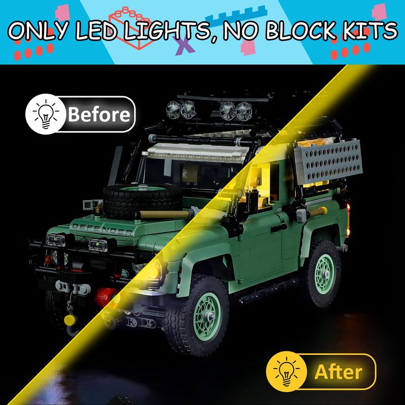 - 【DESIGNED FOR LEGO 10317】- LED lighting designed specifically for Lego 10317 Icons Land-Rover Classic Defender 90 set, with this lighting kit you can transform your building set from dark to bright, bringing it to life.(LED light only, Not Building Block Kit).