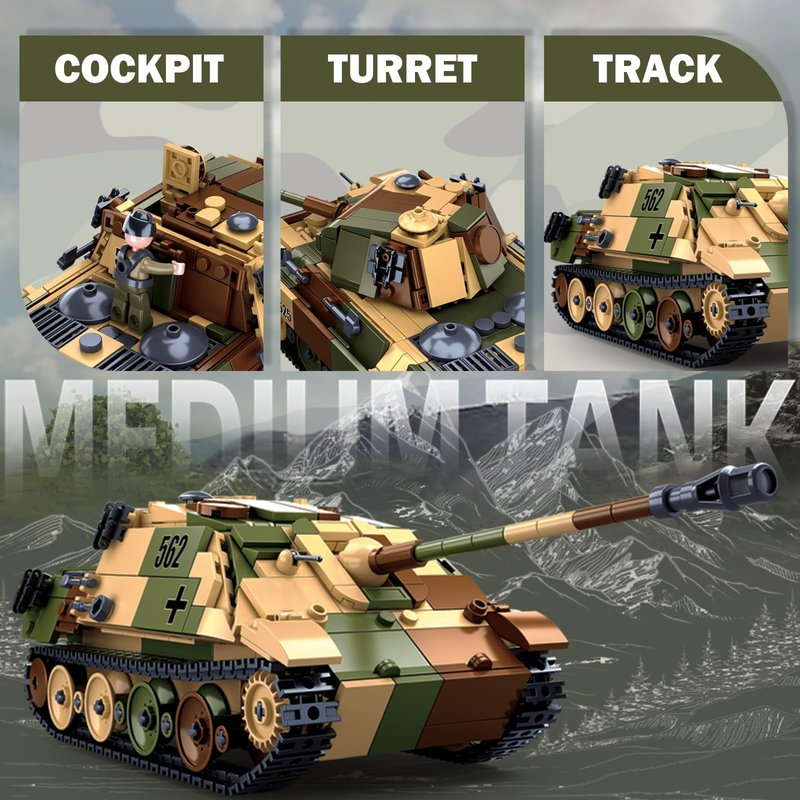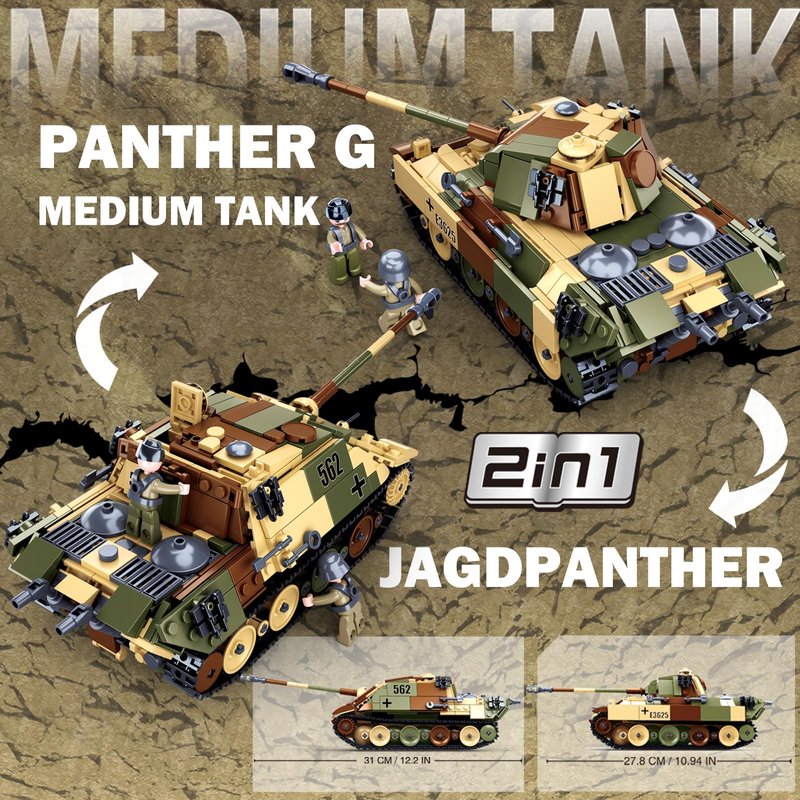 - 【Legendary Tank Building Set】Inspired by the legacy of WW2 Army Tanks and the advanced design of the Panther G Medium Tank/Jagdpanther, 2 in 1 Brick Set, this scaled1/35 Tank Brick Building Set includes 3 Soldier Minifigures and is compatible with lego army military. Boasting a realistic appearance and a rotatable turret, this set goes beyond the basics, featuring a range of movable accessories that bring the tank to life. Kids can manipulate the tracks and other parts to simulate movement scenes.