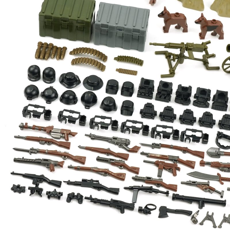 - 【Over 150 accessories pieces】 WW2 heavy machine guns, parachute, various guns, bulletproof vest and helmet, bushes and hills, road blocks, gun box and other military supplies. All parts shown on the picture are included.