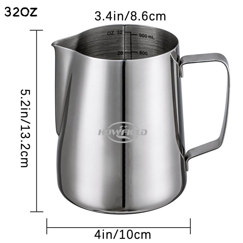 - ☕【Perfect Capacity and Measurements】With a generous capacity of 32 ounces (900 milliliters), this frothing pitcher provides ample space for frothing milk while allowing enough room for expansion during the frothing process. The interior is marked with clear measurement scales for precise pouring and proportioning, ensuring consistent results every time.