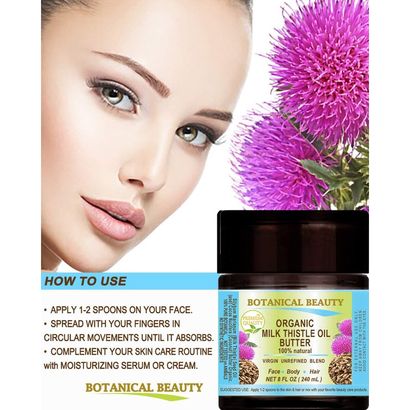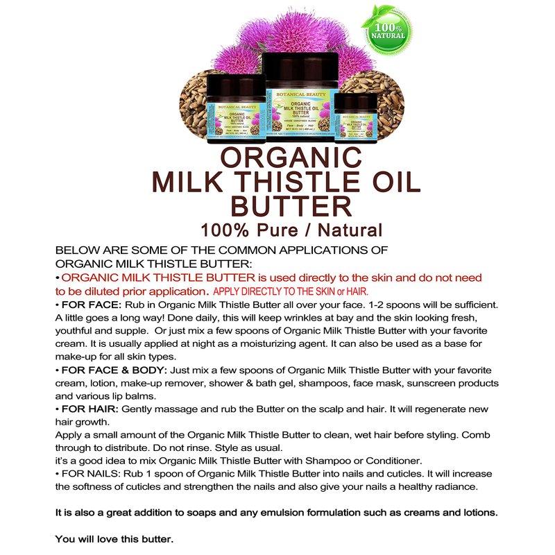 Botanical Beauty MILK THISTLE SEED OIL BUTTER has restorative, deeply hydrates the skin, helps to heal damaged skin and makes it look younger and supplier. A Little Goes a Long Way, Absorbs Quickly, Not Greasy, Chemical Free, Not tested on Animals, Does not contain any preservatives.