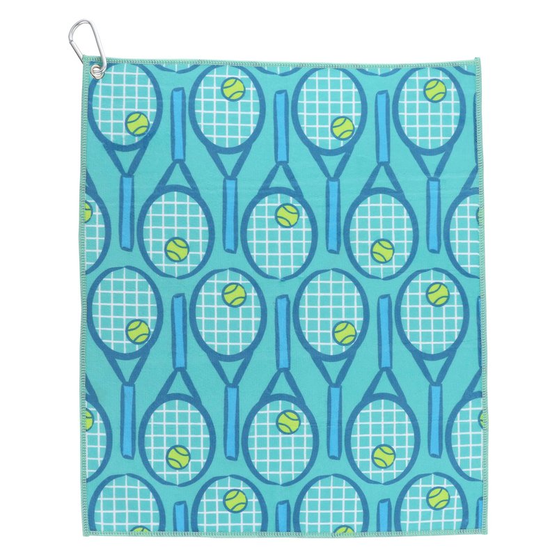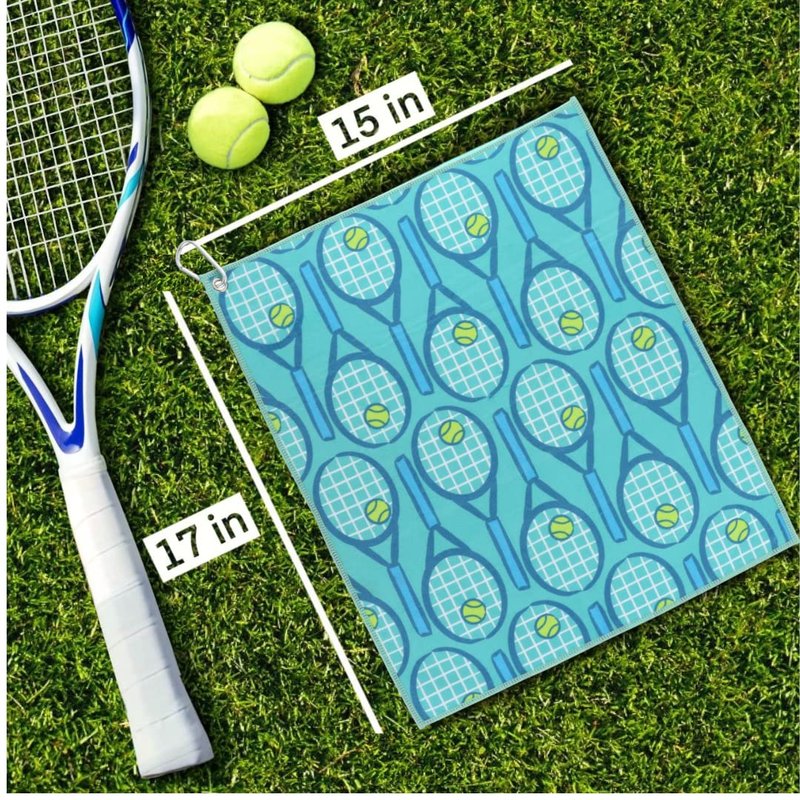 Millie Rose Tennis Towels in Multi Fashion Prints - Soft Microfiber Cotton 15x17 inch Tennis Towels with Carabiner Clip - Tennis Gifts (Blue & Green Tennis Racket)