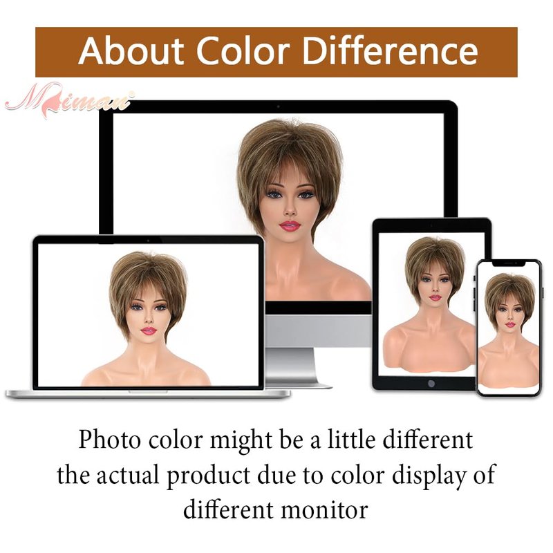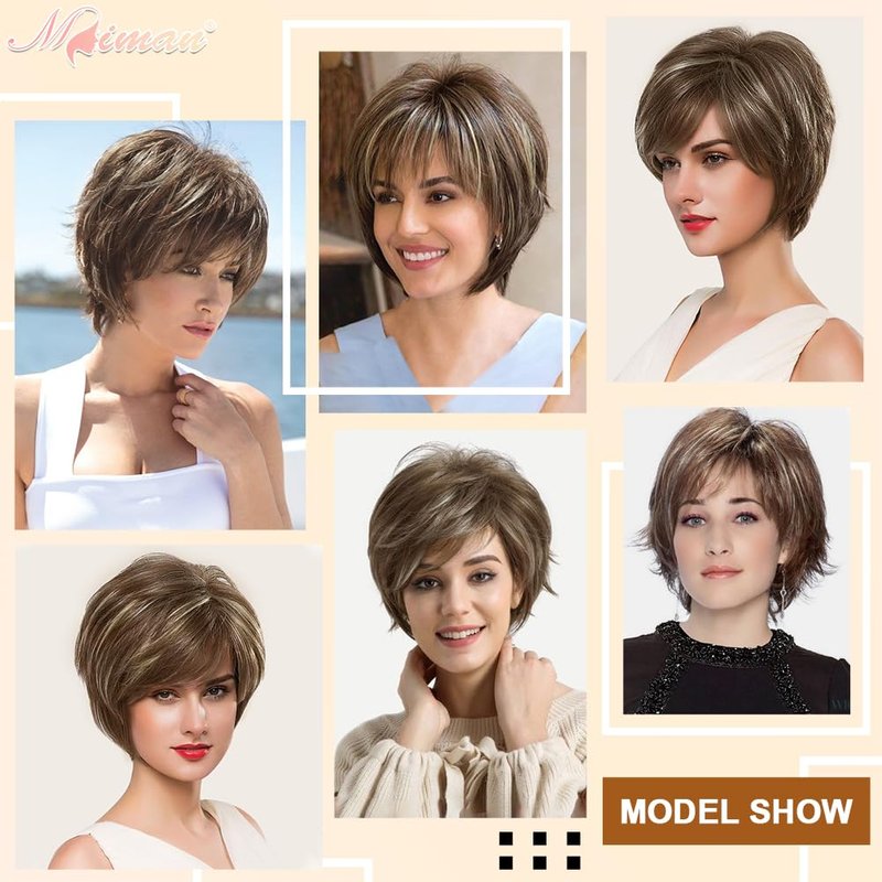- About Color: Short blonde wig or short brown wig, no, it is brown mixed blonde highlight wigs, light brown dark roots, blonde highlight is ash blonde, a proper mix of blonde hair and brown hair will look more natural and make people look younger and more energetic. (Note: Different screens, different resolutions, and different lights will cause slightly different color differences)