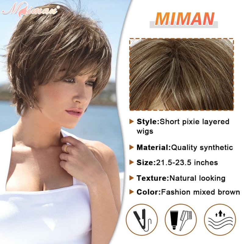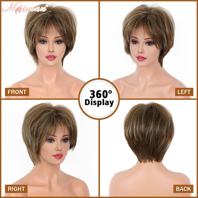MIMAN Short Hair Wigs with Bangs Brown Mixed Blonde Pixie Cut Wig Short Hair Cuts for Women Natural Looking Synthetic Wigs for Halloween Costumes Daily Party Use