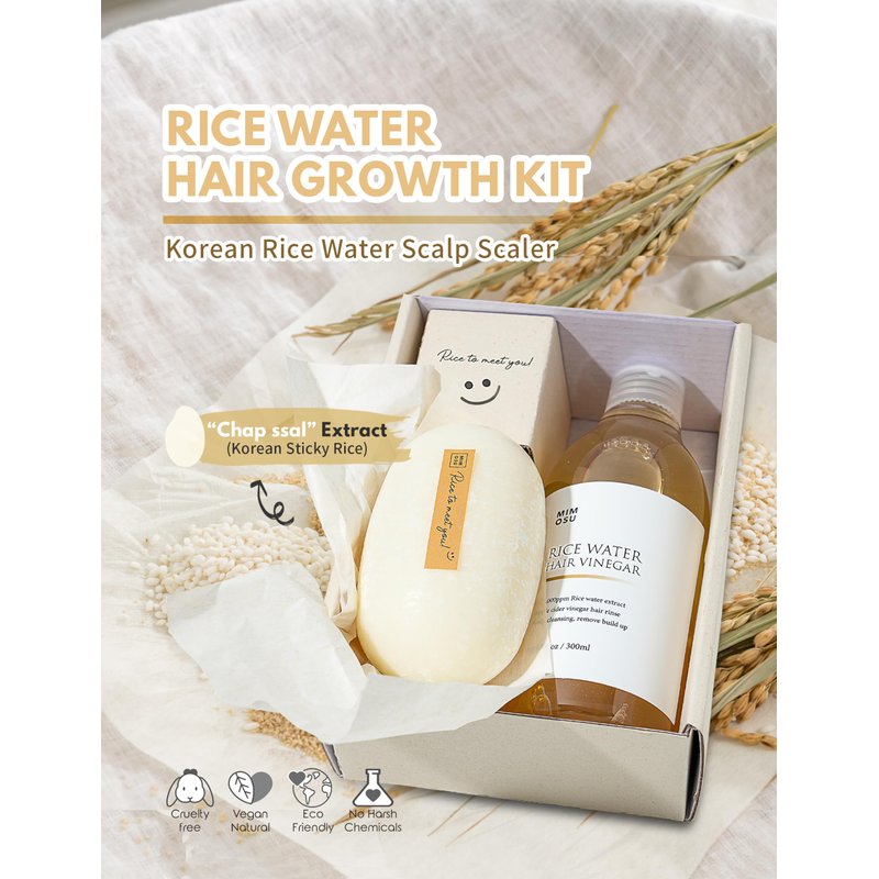 - mimosu Secret Rice Water for Hair Growth : In Korea, sticky rice known as CHAPSSAL serves as both a staple food and a traditional hair care ingredient due to its unique moisture-retaining properties. The mimosu Rice Water offers moisturizing effects for hair and scalp nourishment, harnessing the natural benefits of sticky rice.