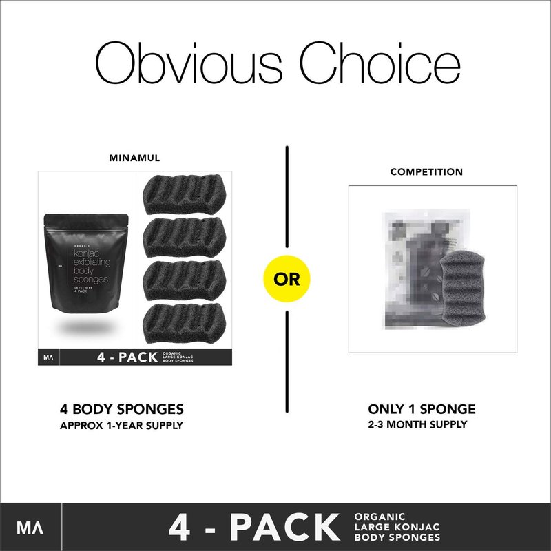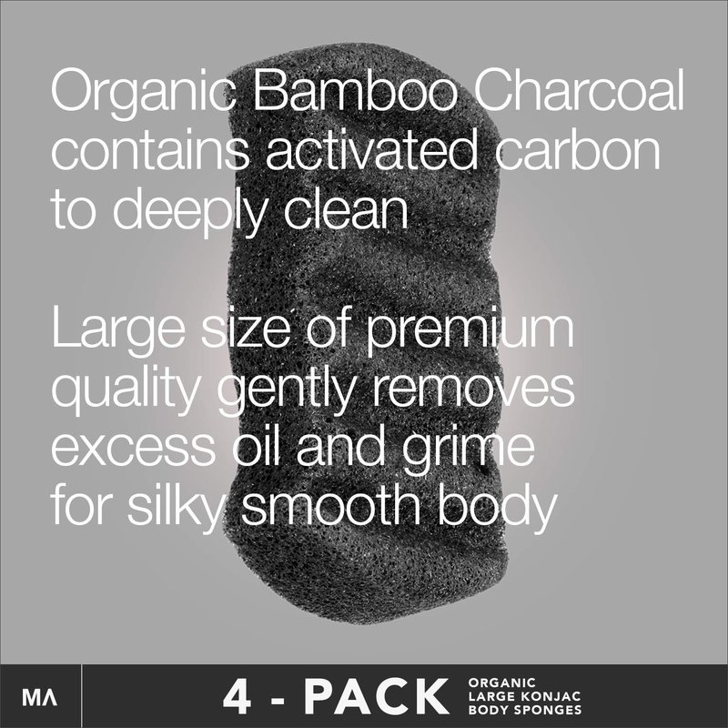 Minamul Konjac Exfoliating Organic Body Sponge | Gentle Daily Body face Scrub/Skincare | Infused with Best Bamboo Activated Charcoal | Safe for Oily, Dry, Combination or Sensitive Skin | 4 Pack Set
