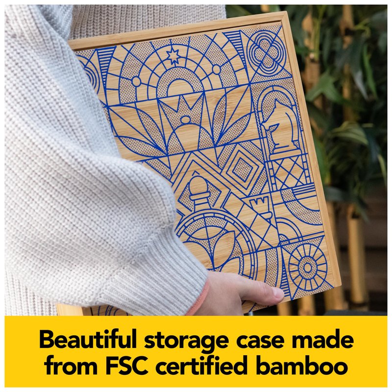 - ECO-FRIENDLY PRODUCT: This checkers/chess set is made with renewable bamboo, plastic-free packaging, and responsibly-sourced materials. The storage case is made from bamboo.