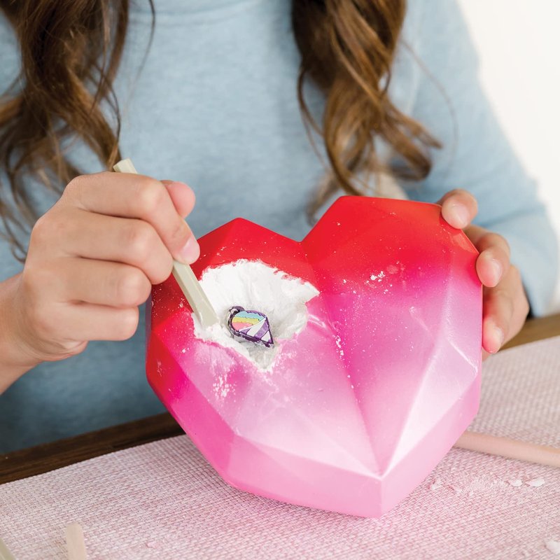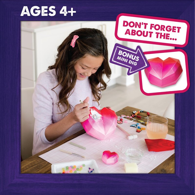 - INCLUDES: 1 giant heart dig filled with 12 charms, 1 bonus mini dig with charm surprise, 2 chiseling tools, 1 hammer, 1 charm cleaning brush, 1 sponge, 3 bracelet cords, 75 beads, velvet storage bag and guidebook.