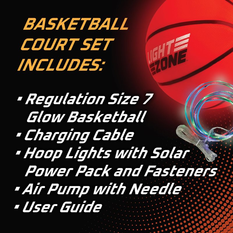 Bring the thrill of nighttime basketball to your backyard with the LightZone Glow Basketball Court Set! Designed for enthusiasts as young as 5 to adults, this set ensures that the fun doesn’t stop when the sun goes down. Featuring a glow up basketball and waterproof LED basketball hoop lights with a solar pack, this set is perfect for those looking to elevate their game with a luminous twist. The centerpiece of the LightZone Glow Basketball Court Set is the light-up basketball. Bounce it to activate the glow and watch it illuminate the court with every dribble and shot. The glow in dark basketball is equipped with a type C charging port, making it easy to recharge and get back into the game quickly. After a period of inactivity, the ball automatically turns off to conserve energy, ensuring it's always ready when you are. Complementing the light-up basketball, the set includes a dazzling array of waterproof LED basketball hoop lights. These lights are not only durable but also versatile, offering three different colors and seven changing modes. Whether you prefer steady glow in the dark basketball rim lights or a dynamic light show, this set has you covered. Powered by a solar pack, the hoop lights are cost-effective, providing hours of nighttime entertainment without worrying about batteries. The included air pump ensures your glowing basketball is always inflated to perfection. The LightZone Glow Basketball Court Set is the ultimate gift for basketball enthusiasts eager to play after dark. Whether you're hosting a neighborhood game or practicing your shots solo, the light up basketball glow in the dark court set promises an unforgettable nighttime experience. Transform your driveway or backyard into a lighted basketball arena and keep the game going long after sunset!