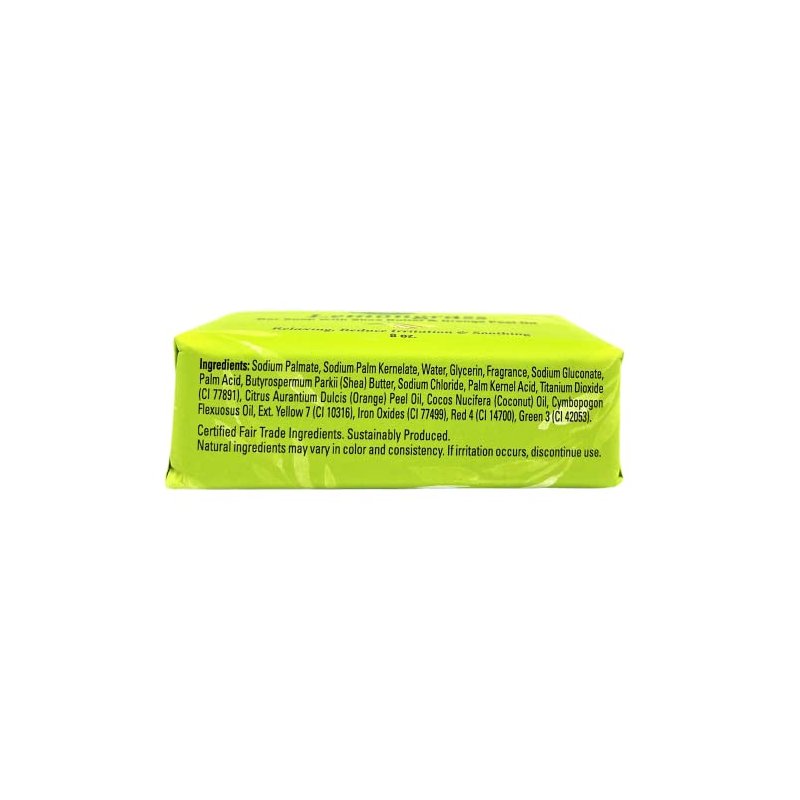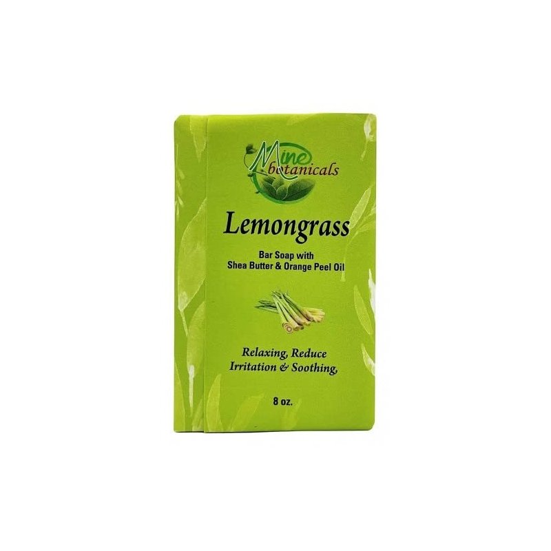 Lemongrass Bar Soap with Shea Butter & Orange Peel Oil Relaxing, Reduce Irritation & Soothing 8 oz. Ingredients: Sodium Palmate, Sodium Palm Kernelate, Water, Glycerin, Fragrance, Sodium Gluconate, Palm Acid, Butyrospermum Parkii (Shea) Butter, Sodium Chloride, Palm Kernel Acid, Titanium Dioxide (CI 77891), Citrus Aurantium Dulcis (Orange) Peel Oil, Cocos Nucifera (Coconut) Oil, Cymbopogon Flexuous Oil, Ext. Yellow 7 (CI 10316), Iron Oxides (CI 77499), Red 4 (CI 14700), Green 3 (CI 42053). Certified Fair Trade Ingredients. Sustainably Produced. Manufactured in the USA with ethically sourced ingredients from around the world Natural ingredients may vary in color and consistency. If irritation occurs, discontinue use. www.minebotanicals.com