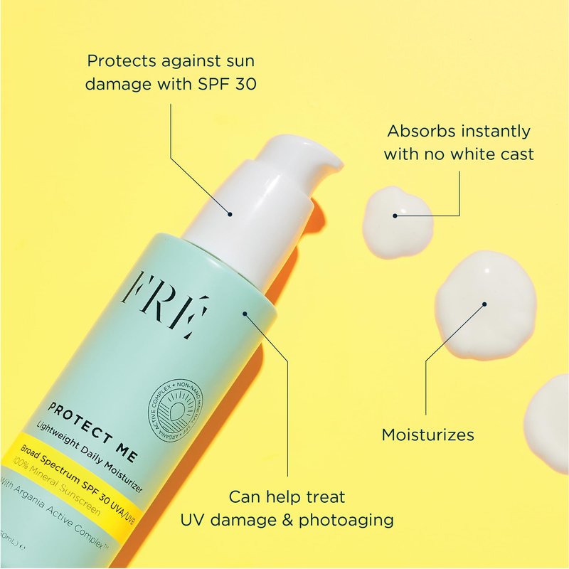 - All In One Hydrating Sunscreen: PROTECT ME 30 is FRÉ's breakthrough facial sunscreen that delivers our antioxidant-rich patent (Argania Active Complex), 100% mineral sunscreen (non-nano zinc oxide), and weightless hydration. This ultra sheer formula is water-resistant, non-comedogenic, and absorbs instantly with no white cast on your face. PROTECT ME 30 creates an invisible shield of protection for your face tough enough for even the sunniest days. Use it daily for strong, healthy skin.