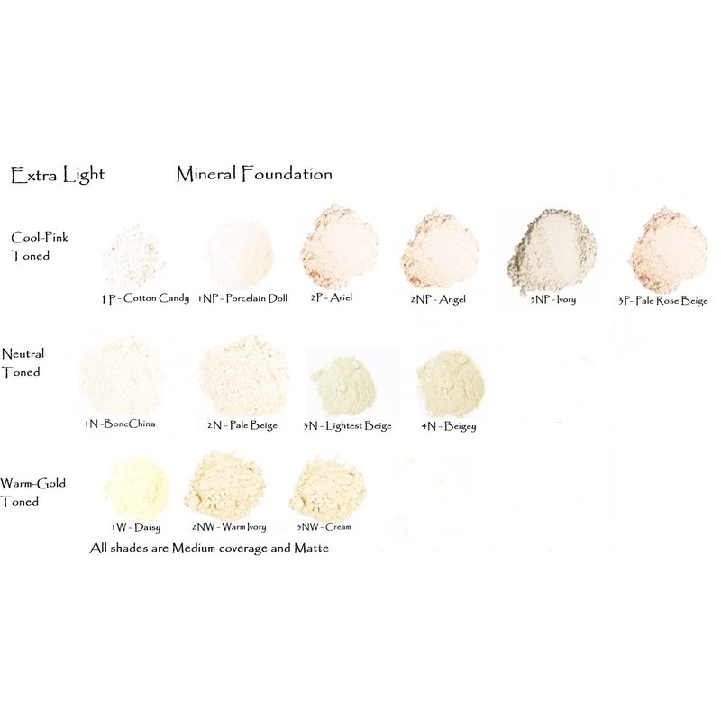 Our lightest shade range from palest porcelain to ivory. The shade level and tone is indicated by the number/Letters before the color name. Shades in this group range from 1 being nearly white to 3 - very light Ivory. Tones are N - Neutral NP - Neutral Pinkish P - Pinkish NW - Neutral Warm W - Warm OL - Olive (ashy ) IE: 1N = Palest shade - Neutral Tone 2NP = 2nd palest level with a Neutral Pink tone 3NW = Pale Ivory with a slightly warm tone. Natural mineral foundation gives the most natural makeup coverage possible. Perfect for young skin as well as mature. Helps cover imperfections without a cakey or heavy feel. Very lightweight and natural feeling. Zinc oxide is a natural sunscreen an is soothing for troubled skin. Perfect for Rosacea sufferers. Easy and quick to apply, just buff it on with a fluffy brush. Our foundation contains zinc oxide a natural healing mineral that is a natural sunscreen. Great foundation for rosacea and acne sufferers. The pale collection in order from palest to a light Ivory - with a neutral tone. Only for very white skin, may look chalky on other skin tones. If you are not sure of the shade you need please message us before purchasing - if you can include a photo we can help you select a color. We also offer a 5 shade trial set in small pots so you can try out different shades first.