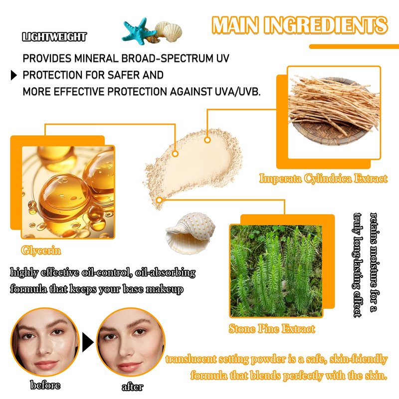 - 🌈【Long-lasting Makeup Setting】Translucent powder sunscreen locks makeup in place, providing long-lasting oil control and water resistance, so that sophisticated beauty stays in place longer.