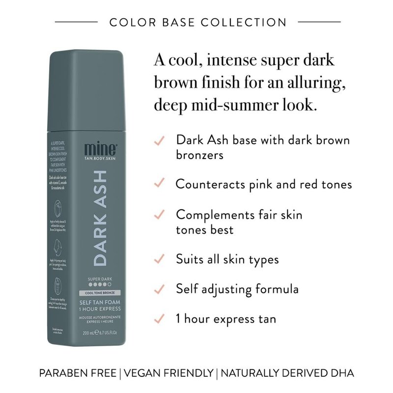 DARK ASH BASE 1 HOUR EXPRESS TAN FOR A COOL, INTENSE SUPER DARK BROWN SKIN FINISH Dark Ash gives you a cool, intense super dark brown finish. A mix of dark ash brown bronzers counteracts pink and red undertones in your skin to deliver a natural looking, intensely cool dark brown tan. This easy to apply, streak free and self adjusting formula ensures a seamless application every time. The dark ash brown bronzers work with tan extending multi-vitamins and oils to deliver a picture perfect tan in an instant that continues to develop into a cool, super dark brown finish without the fake tan smell. Dark Ash Self Tan Foam suits all skin types and tones for those wanting a cool, intense super dark brown skin finish. Recommended for fair skin or those with pink undertones. Size: 200ml | 6.7 fl oz Lightweight & fast drying | No orange tones | Salon formula | Even fade | Australia's iconic beach bronze