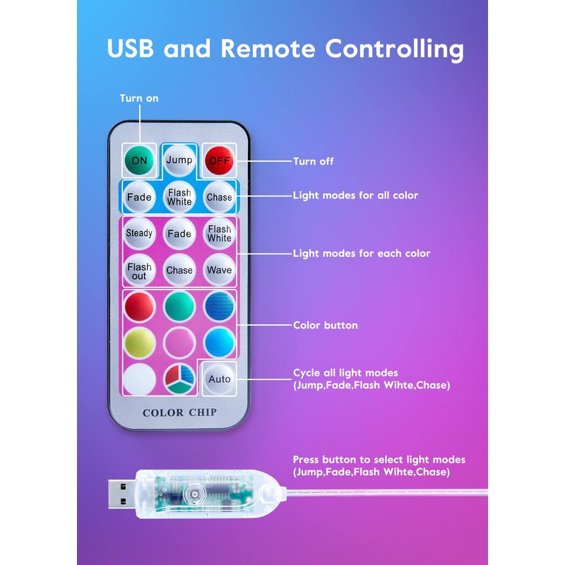 - Twinkle Fairy Lights with Remote: The remote effective range can reach 16 ft. You can use the remote to point at the receiver in the USB plug, turn the fairy lights for bedroom on and off, choose the color or modes of the light. 4 modes on top of remote will light up for all colors, If you want to light up the single color, you can choose one of 6 modes on the middle of remote, then choose the color you like. And auto mode will cycle all the modes