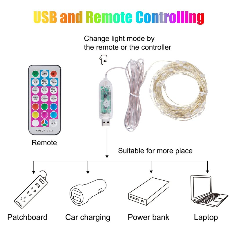 - USB Powered: USB plug is suitable for power bank, car charging, adapters, notebook computers, USB hubs, etc. Easy to use and carry, you can light up these LED fairy lights colorful anywhere. Please note that the USB adapters are not included