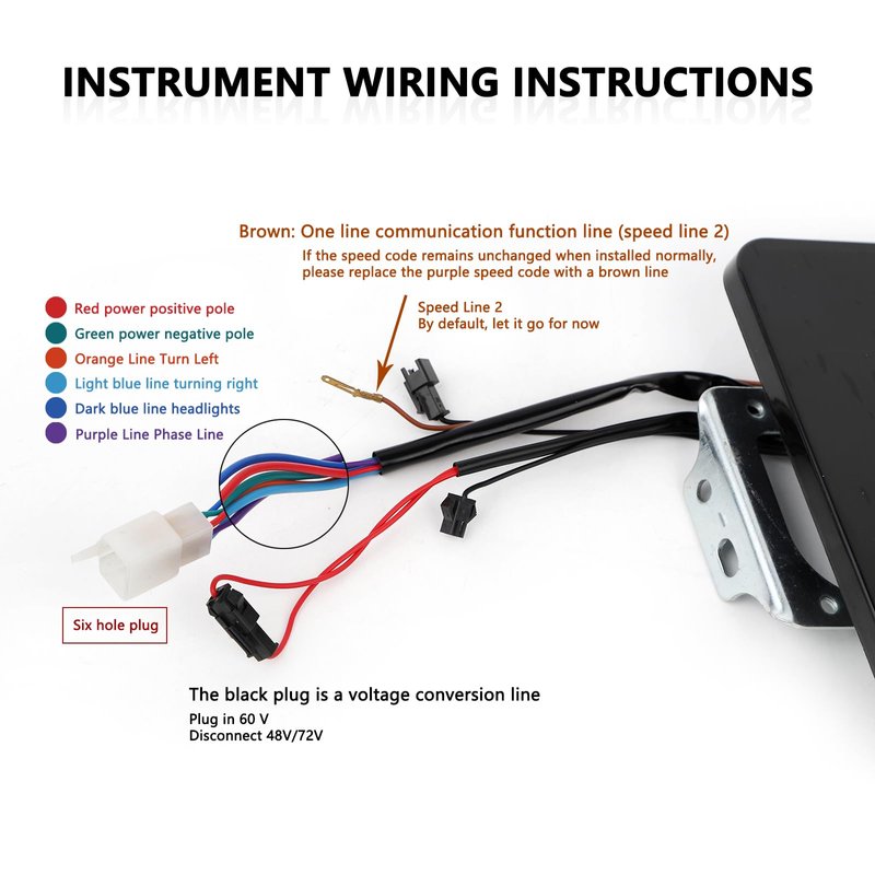 - ★ Red wire: positive; Green wire: negative; Orange wire: left steering; Light blue wire: right steering; Purple wire: one line through; Dark blue: headlight;Brown wire: phase line