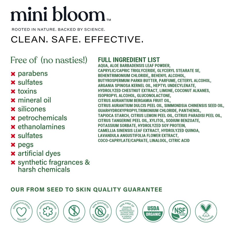 - THE MINI BLOOM DIFFERENCE: We are a line of skincare products for you and your family. Rooted in nature and backed by botanical science. Our products are composed of ingredients you can identify (IYCI) and sourced with a greater sense of social responsibility. Dedicated to an eco-conscious way of development from creation to delivery. Committed to offering high quality, hypoallergenic, nourishing and essential goods for babies, little ones and mamas and papas, all those who care for our kids.