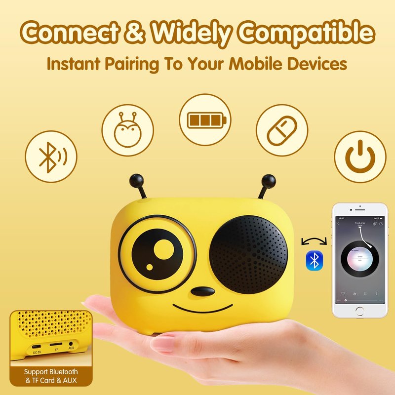 - 【Unique Little Bee Designed & Bluetooth 5.3】The mini karaoke machine, featuring an adorable little bee motif, is sure to delight and captivate a child's heart. Its charming design not only makes it visually appealing but also adds an element of fun that will enhance the overall karaoke experience for girls/boys. Kids karaoke machine is perfect for sparking joy and encouraging musical creativity.This Bluetooth speaker with wireless microphone for children or adults has built-in the latest Bluetooth 5.3 can support within 32 feet distance.Don't worry about sudden signal cut.Instant pairing to your mobile devices with great stability.Supports a TF card stored with MP3 songs and AUX connection.