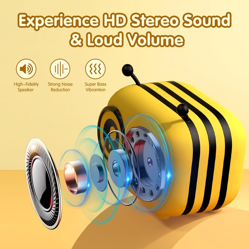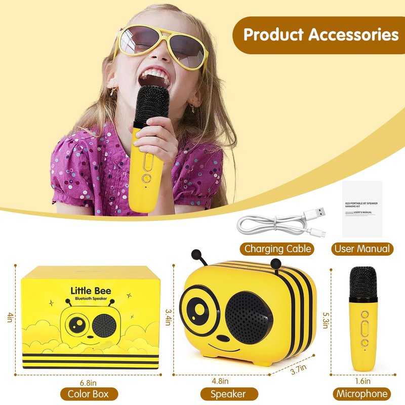 - 【Superior Sound Penetration】Mini karaoke machine with a cute little bee appearance and simple operation for all ages people to enjoy.The Bluetooth speaker is adopted high-performance audio driver and an advanced digital signal processor as well as noise reduction technology,which make kids karaoke machine sound quality clearer 360° stereo and avoid annoying mike feedback.