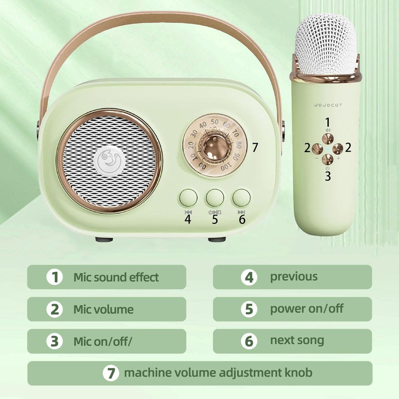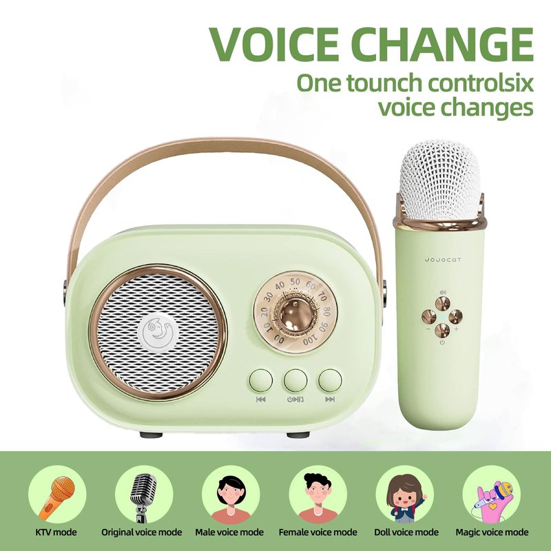 - Dual Microphone: Mini karaoke machine with 2 microphones, theinclusion six fun sound effects(Original, KTV Mode, Female, Male, Child, Magic), short press the MIc On/Off button andswitch between the original voice or accompaniment modealternately