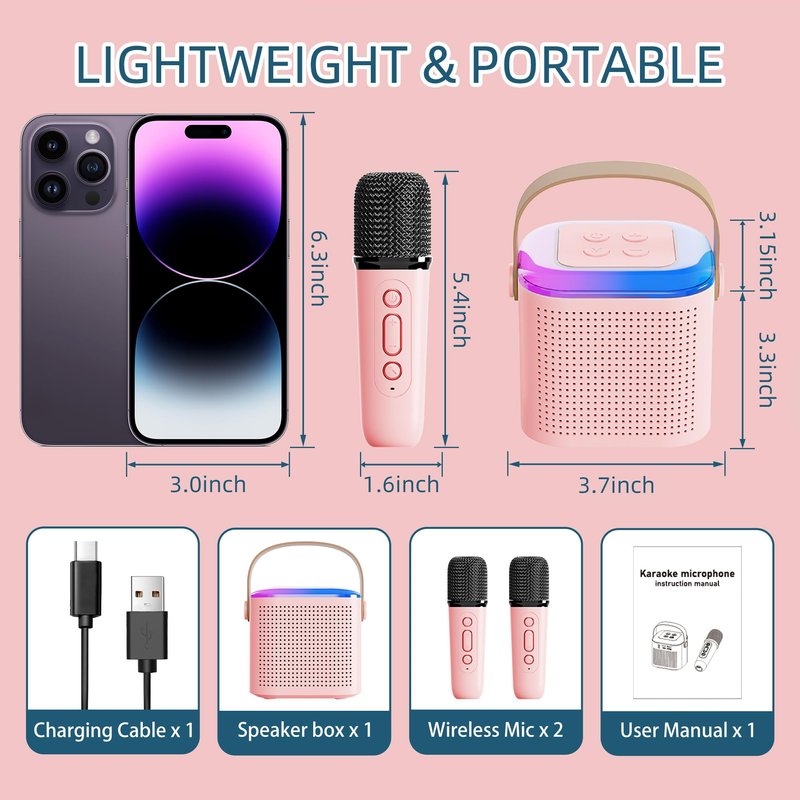 Mini Karaoke Machine for Kids,Portable Bluetooth Speaker with Wireless Microphone for Kids Toddler,Gifts for Girls and Boys Birthday (Pink 2 mic) (Pink 2 mic)