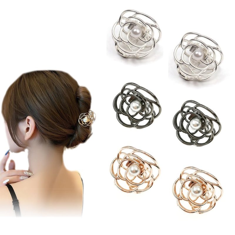 Mini Rose Flower Hair Claw Clips for Women 1.5Inch Cute Pearl Small Hair Clip | 6 Pcs Metal Black Gold Silver Lady and Girls Fine Hair Fancy Horsetail Clips