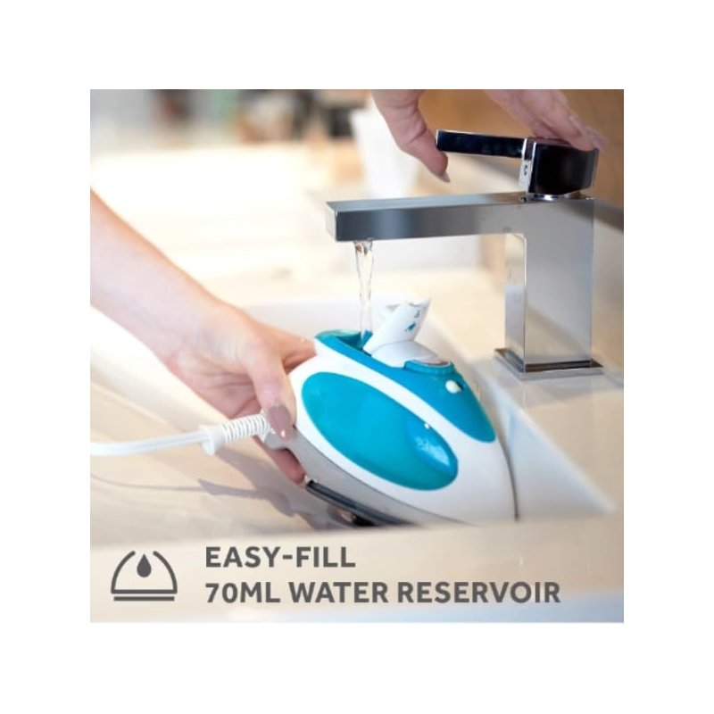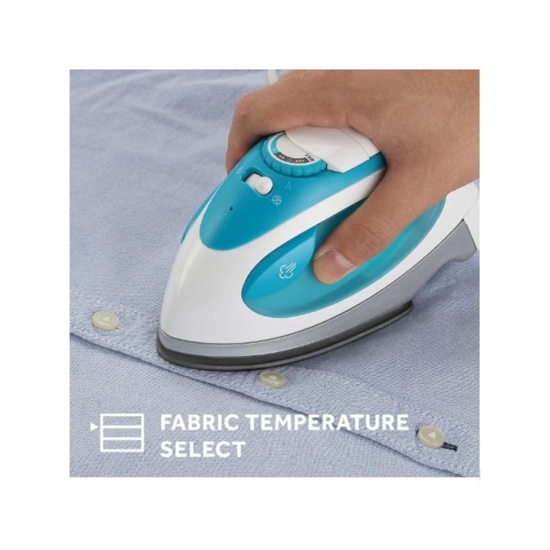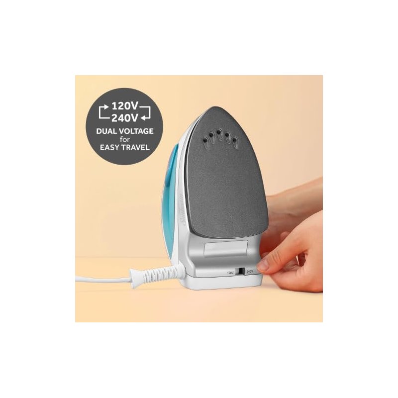 Make wrinkle-free clothing a reality anywhere with this versatile travel steam iron. Featuring a practical 120V/240V dual voltage system, this 1080-watt iron seamlessly transitions from domestic to international use. The non-stick soleplate glides effortlessly across fabrics, while the adjustable temperature control lets you precisely manage heat settings for different materials from delicate silks to sturdy linens. At just 1.2 pounds, this compact powerhouse won't weigh down your luggage. The iron offers both horizontal and vertical steaming capabilities, perfect for refreshing hanging garments and drapery. The ergonomic soft-touch handle ensures comfortable control during use, while the included travel bag keeps everything organized on the go. The sleek white and teal design combines style with functionality, making it an essential companion for business travelers or anyone who wants to maintain a polished appearance away from home.