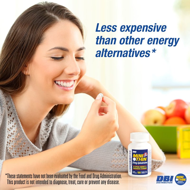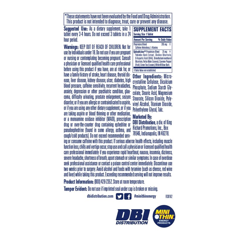 Mini Thin 25mg Ephedrizine delivers Two-Way Action for High Speed Energy and Enhanced Stamina.* It does this at a fraction of the cost of energy drinks per serving.* Created with busy and active people in mind, it is the optimal alternative to consuming high-sugar energy products.* Mini Thins are packed with energy boosting and fat burning compounds like Yohimbe, Choline, D-Aspartic acid (DAA), DMAE, Yerba mate, Cayenne Pepper, Green Tea, and White Willow Bark.*A multiple dose pack or bottle of Mini Thin conveniently fits in a shirt pocket, purse, or car cup holder. Caffeine pills are the perfect alternative to energy drinks, energy shots and are a natural source of quick energy, focus and alertness to wake you up and get you going.*