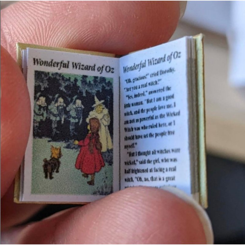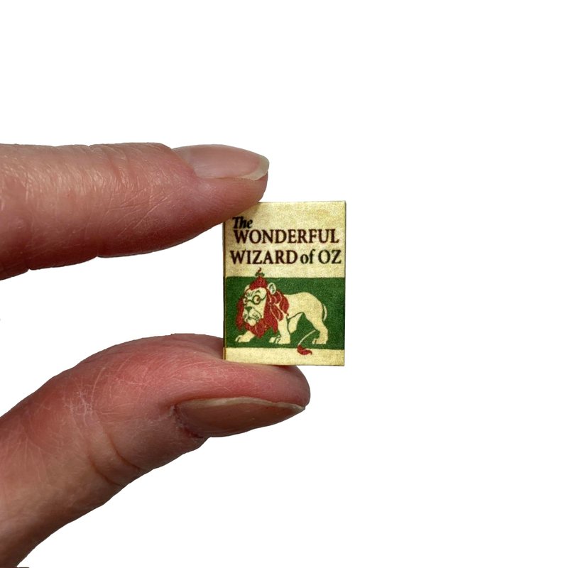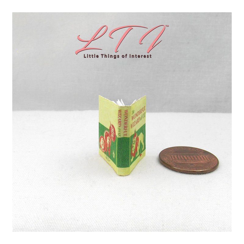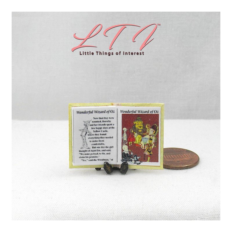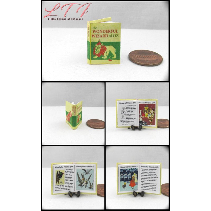 1:12 Scale The Wonderful Wizard of Oz miniature book opens and has 16 readable pages with 6 full color illustrations. This hand made miniature book measures approximately 7/8 of an inch high by 5/8 of an inch wide with the title printed prominently on the spine so it will look GREAT open or closed.