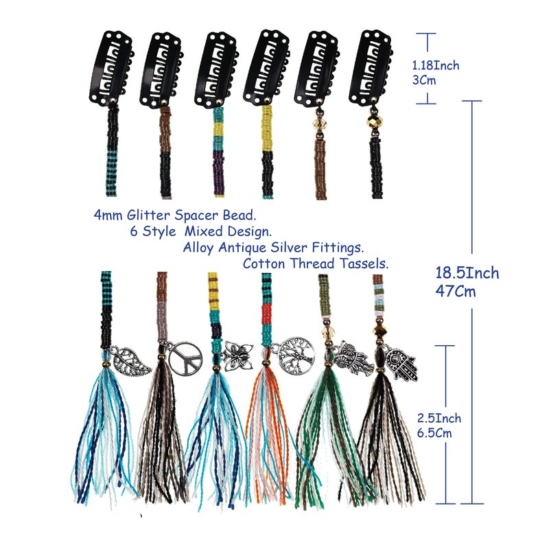 - Handmade -High quality Materials: One order includes 6 color combinations of different styles, Match you hair and color fashion,Glitter plastic spacer bead which is safe, odorless, Not easy to damage and will not fade,Cotton thread tassels,It is flexible and can be bent very slightly into different angles with your hair,Put it all day didn’t have to fix it once.