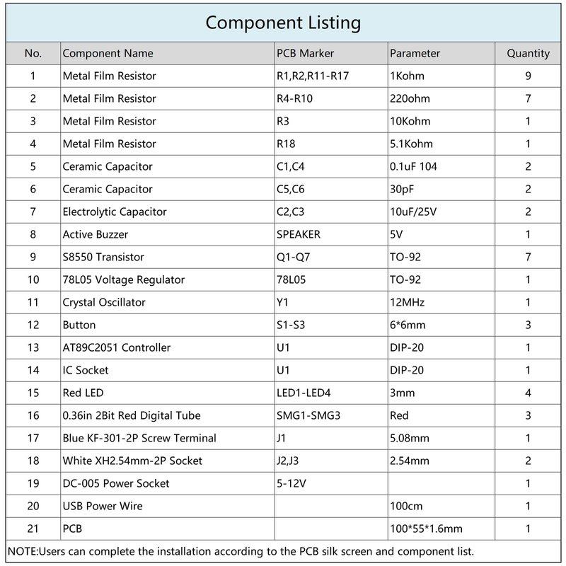 - ⏰【Parameters】: This Electronic Clock Kit is equipped with AT89C2051 master chip. Military-Grade FR-4 PCB board(Size: 3.94"x2.17"(100x55mm)). Comes with a USB cable for DC 5~12V voltage input, plug and play. There are two additional wiring ports for external signal sources.
