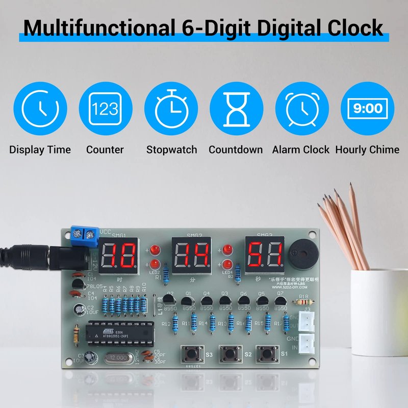 You Wanna Experience Fantastic Electronics Soldering?You /Your Family Are Interested in DIY Electronics Projects?Wanna Spark & Encourage Teenagers' Talents & Passions and Keep Electronics Learning Interesting and Fun?Racked Your Brains About Cool Gifts to Friends/Friends?This Ingenious DIY Clock Kit Born for It. It Makes Learning Not A Dull Thing But A Great Joy. You Will Enjoy The Pleasure of DIY Electronics.This 6-digit Electronic Clock Kit is suitable for Learning Electronics & Practice Soldering Skills for DIYers, Electronic Enthusiasts, STEM Students, Beginners, or Anyone Looking For A Digital Clock/Timer for Projects.What Will You Get?1. Easy-to-Assemble Fun Clock Kit:--This product comes to you is Component Kit needs to be installed to A Cool 6-Digit Digital Electronic Clock. It's helpful to improve the ability to solve practical problems through hands-on practice. In the meanwhile you can enjoy the fun from the DIY projects.--Easy to Assemble: The clock kit components' marker name clearly mapped and labelled on PCB layout makes it easy to assemble.
