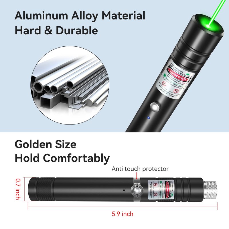 - [Rechargeable Design] Green light flashes when the battery is low. Just rotate the lid off the bottom of the laser pointer and you can charge it, It is compatible with all USB-A chargers, Whether it's a computer, a laptop, a phone charger, a power bank, or a plugboard, you can charge it with a USB port. Charge it for half an hour and you can use it for hours on end.