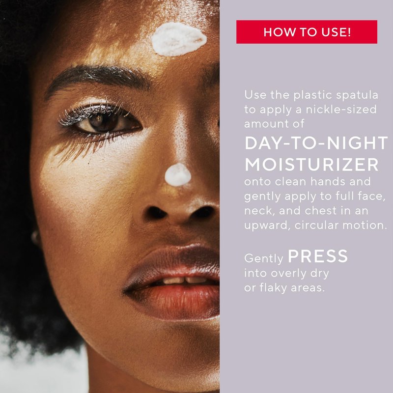 - HOW TO USE - Use the plastic spatula to apply a nickel-sized amount of product onto clean hands and gently apply to full face, neck, and chest in an upward, circular motion. Gently press into overly dry or flaky areas.