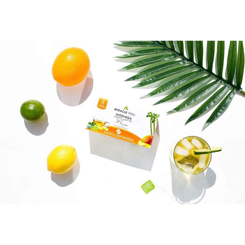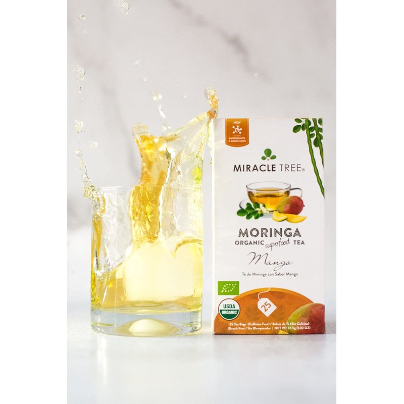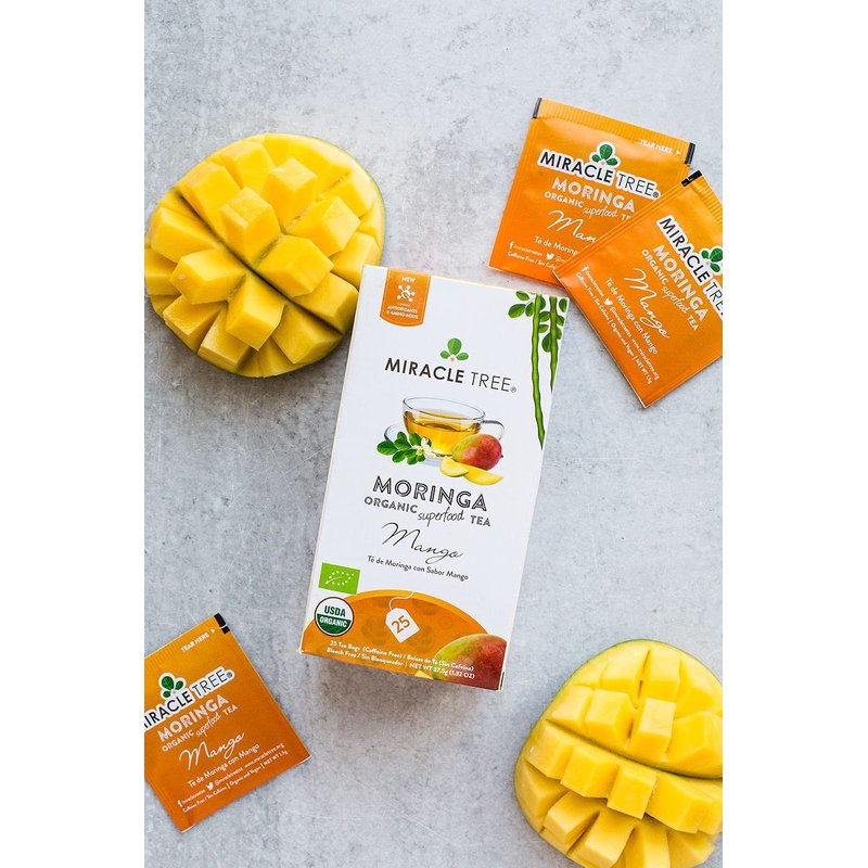 Miracle Tree's Mango & Organic Moringa Superfood Tea is an award-nominated herbal infusion which blends delightful fruity mango flavor with organic Moringa leaves.