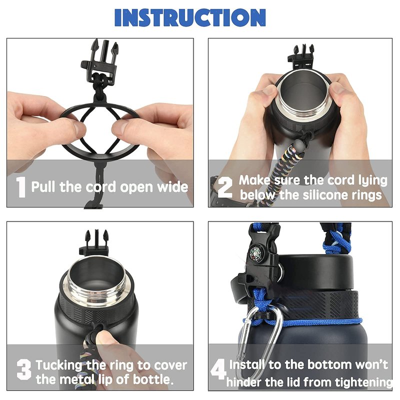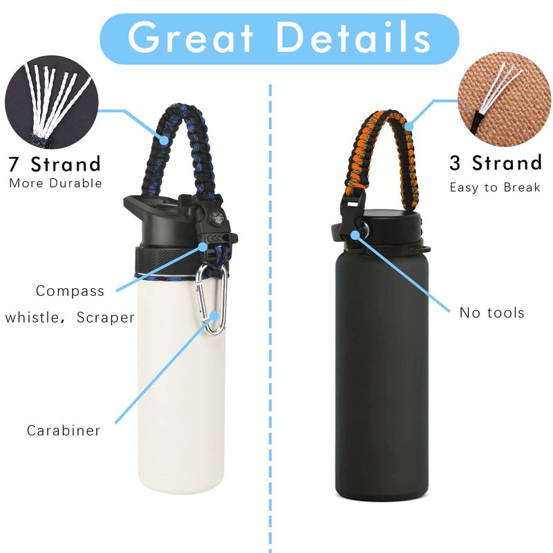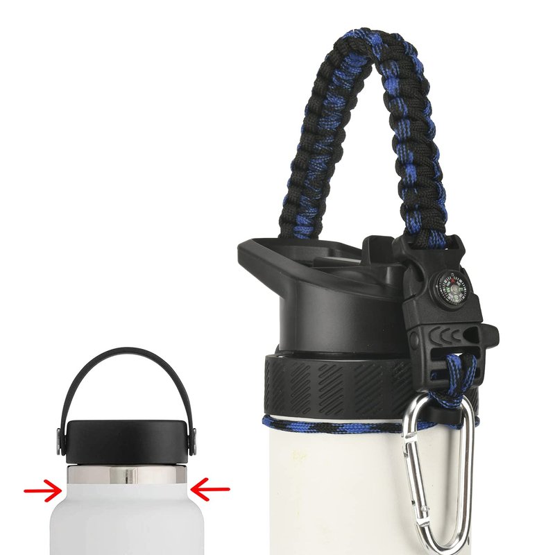 - Multifunctional Handle:With more field survival tools, compass, safety ring, whistle & carabiner. Our wide mouth handle fits hydro flask and the rubber ring can unravel into a solid and tight rope during emergency and survival situations. It will take your trip more safer! It's suitable for hiking, camping, biking, yoga and other indoor and outdoor activities