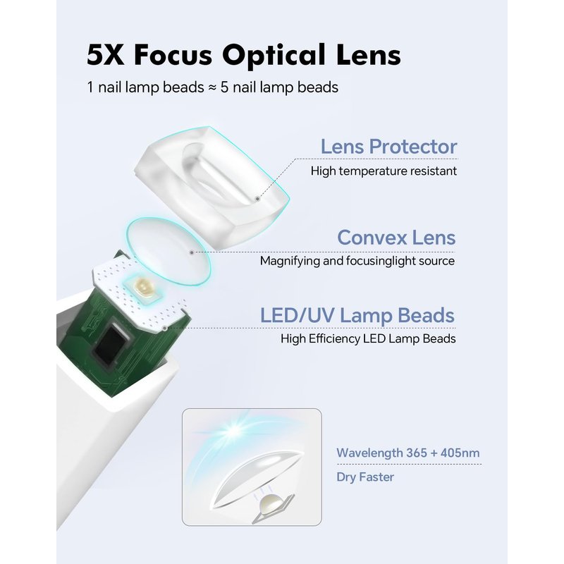 - 【Quick-drying Mini UV Nial Lamp】:The Handheld mini UV lamp adopts an upgraded version of 5 times hard-core convex lens, one lamp bead is equivalent to 5 ordinary lamp beads, so that the nail polish glue dries faster and saves you more time. With its focused beam, ensuring only your nails are effective cured while reducing the risk of unnecessary skin exposure.