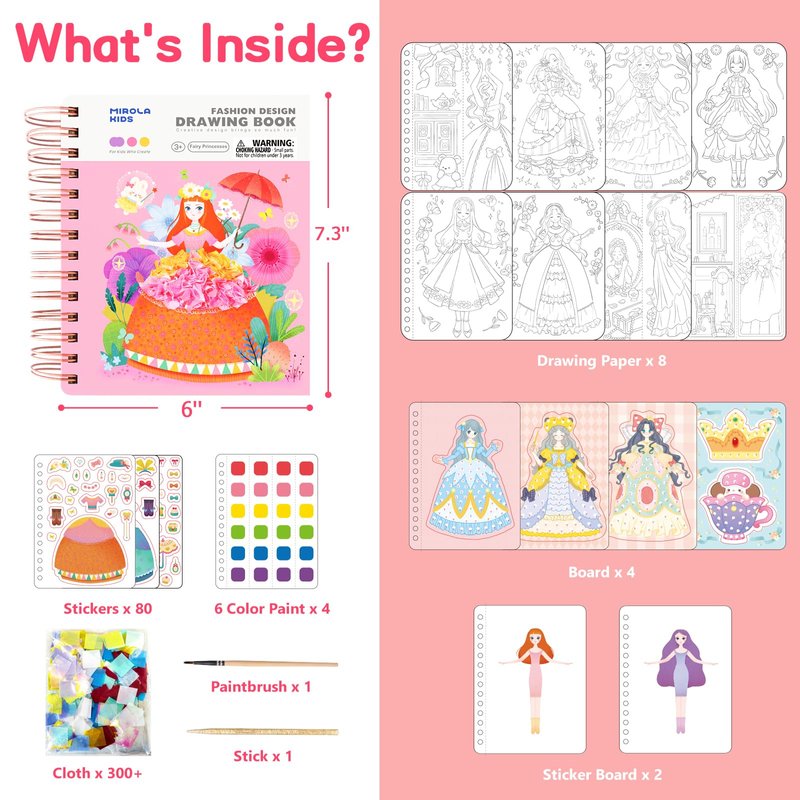 MIROLA KIDS 3 in 1 Fashion Design Drawing Book for Girls, Princess Dress-up Activity Book with Watercolor Painting, Stickers, Poking, Puzzle Puncture Painting for Kids, DIY Craft Kit for 3 4 5 6