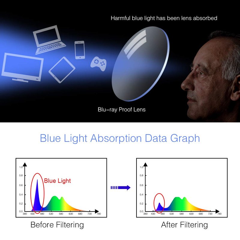 Blue light filter lens feature a special coating that restricts blue light from passing through the lenses.