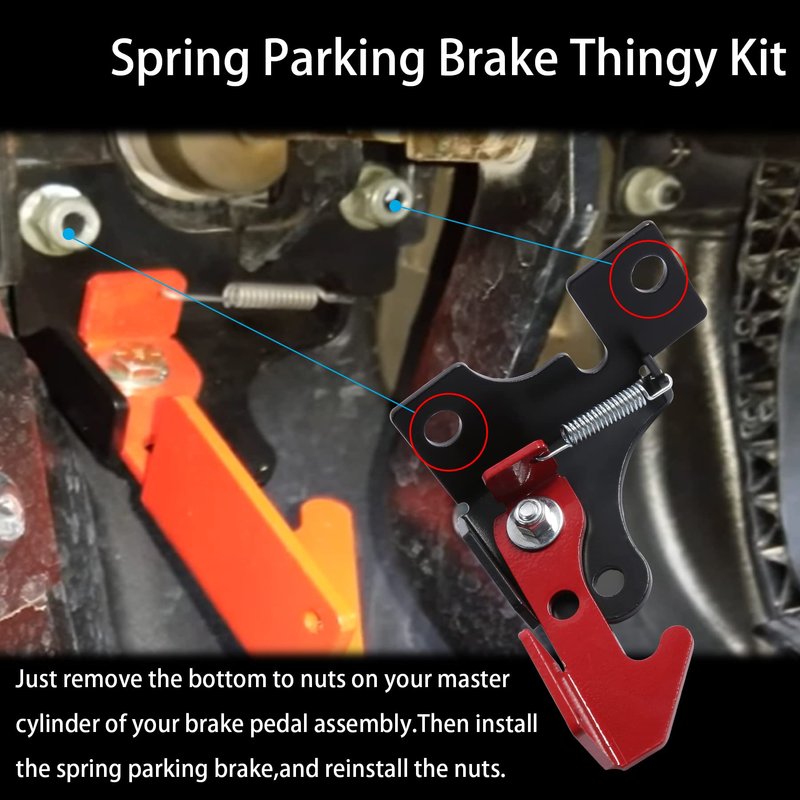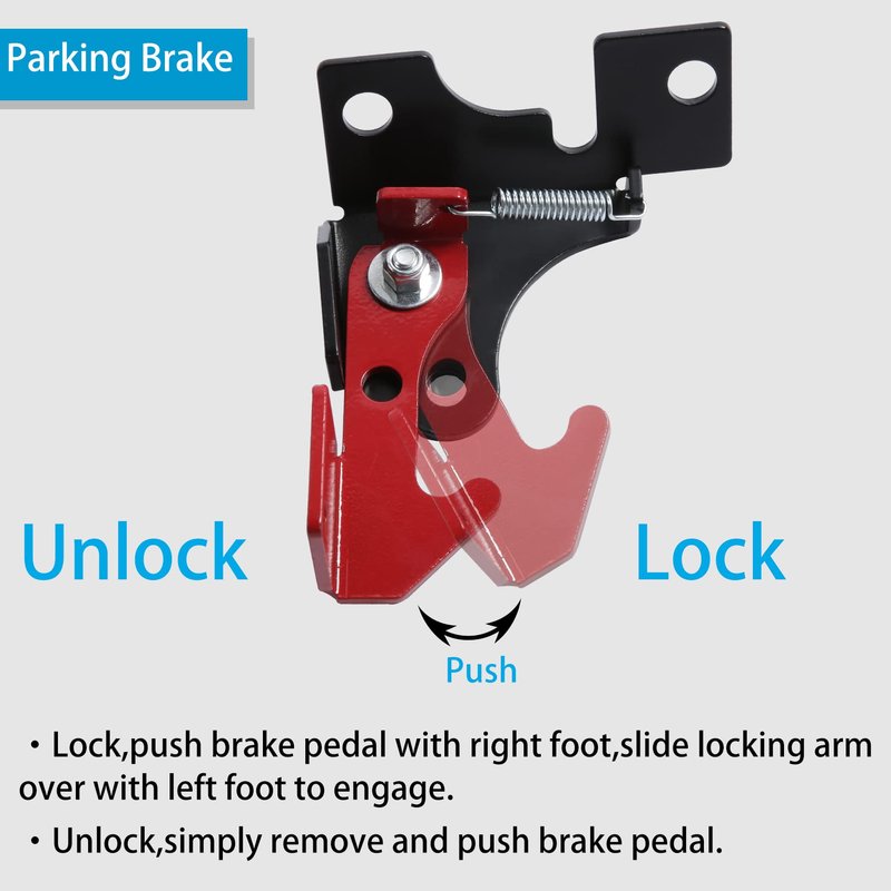 - 【EASY INSTALLTION AND OPERRATION】Simply remove the bottom nut on the brake pedal assembly master cylinder. Then install the spring parking brake. To operate, press the brake pedal with your right foot and slide the locking arm to the engaged position with your left foot. To release, simply remove and press the brake pedal.