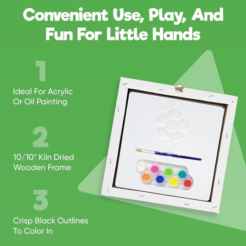 - Package Contents are, 10x10 Pre Drawn Stretched Canvas, 8 colors of paint, Sample image.