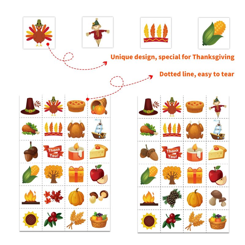 - THANKSGIVING BINGO SET INCLUDE:24Ppcs kids thanksgiving bingo player cards, 385 Pcs player chips and 2 Sheet caller cards.Support enough members to play with ,perfect family and memorable event games with you kids.Just enjoy it.