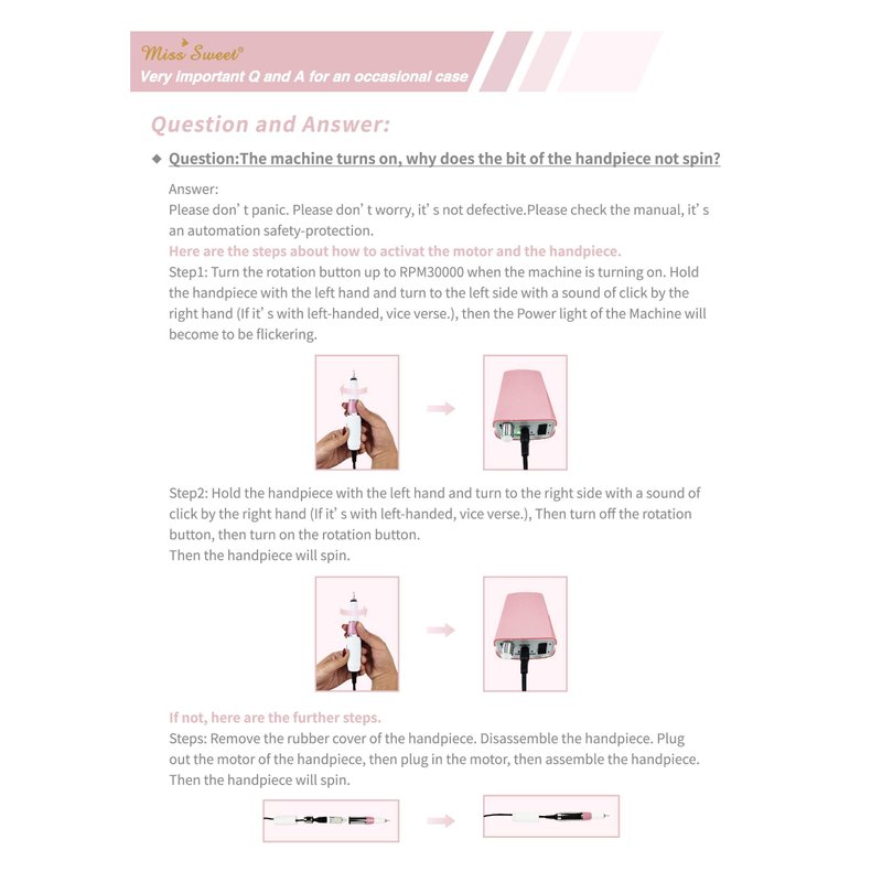 The Miss Sweet Professional Nail drills owns the FCC and CE Certificate.This nail drill is for personal use at home or professional use.Electrical/Plug-in Drill in 110-120V.Powerful: Rotated speed up to 30000RPM.Handpiece is easy slide-in/out type chuck.