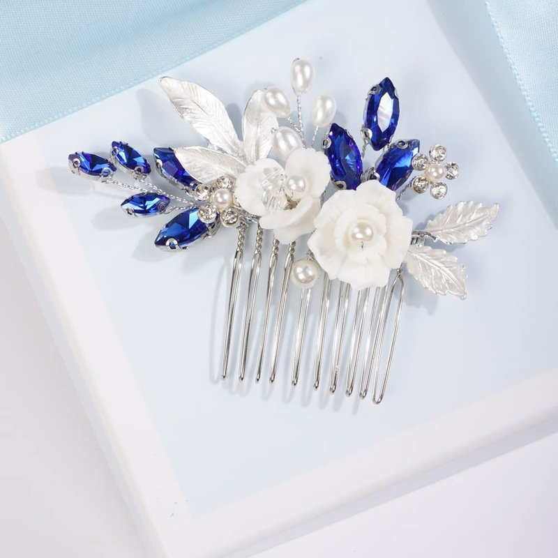 Missgrace Bride Wedding Crystal Pearl Leaf Rhinestones Hair Comb Blue Purple Bridal Hair Pieces Rhinestone Bridal Hair Clip Flower Hair Side Combs Wedding Hair Accessories for Brides Women (Silver Blue)