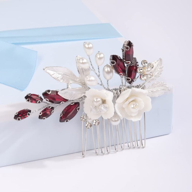 Missgrace Bride Wedding Crystal Pearl Leaf Rhinestones Hair Comb Blue Purple Bridal Hair Pieces Rhinestone Bridal Hair Clip Flower Hair Side Combs Wedding Hair Accessories for Brides Women (Silver Wine Red)